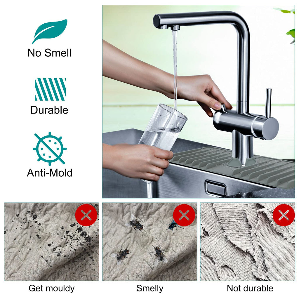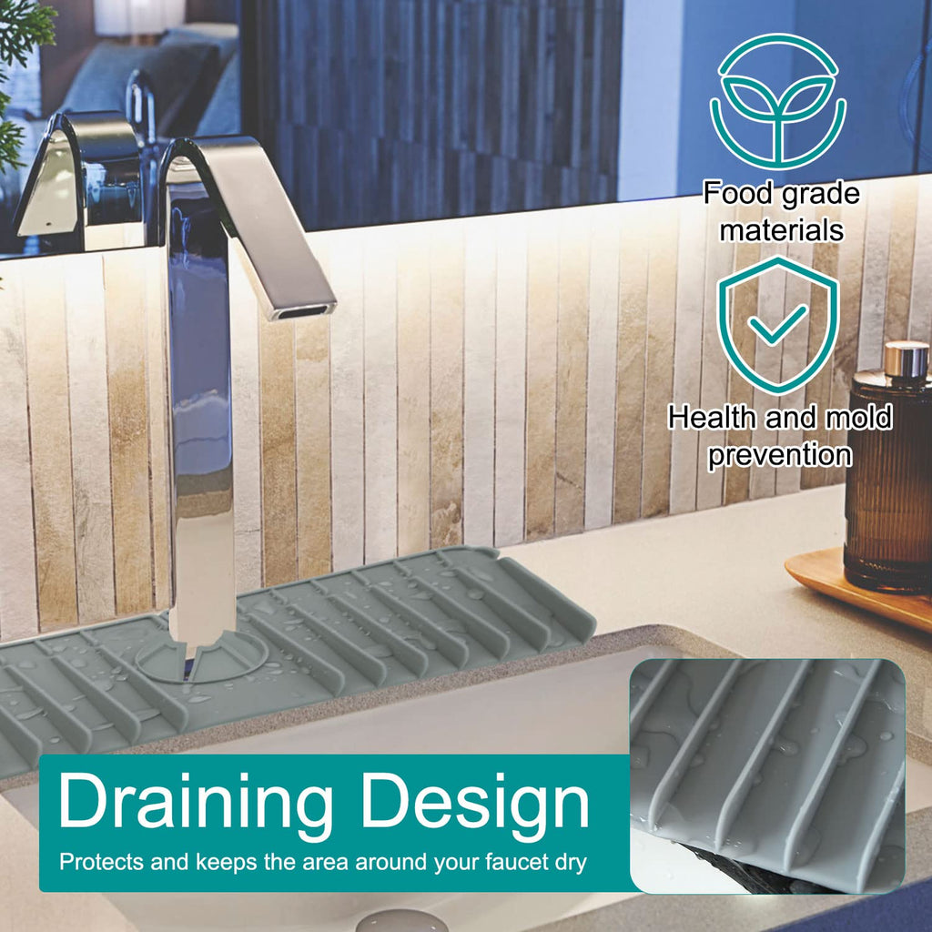 【Upgraded Silicone Faucet Drip Catcher】The tapered channel design of the faucet handle drip catcher tray prevents water from splashing and helps the water flow out of the sink smoothly. Keep the back of the faucet dry, free from odor and mildew.